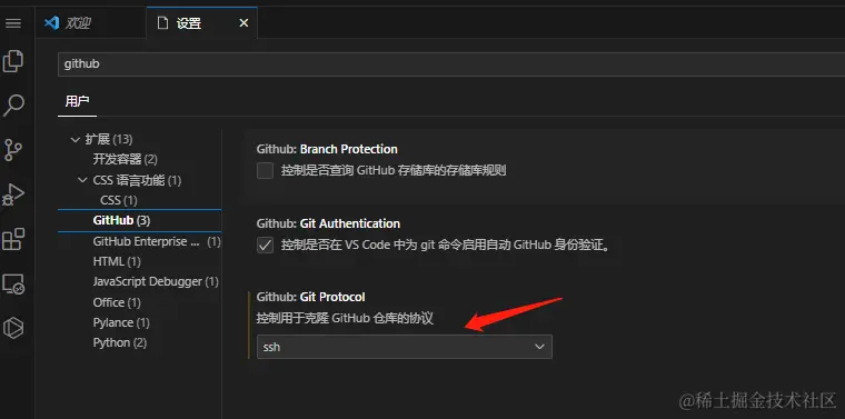 打开 vscode 设置,输入 "github",修改 Git Protocol 为 ssh