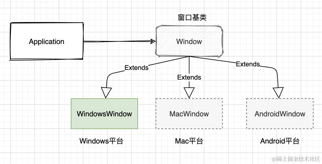 设计一个基类Window,抽象出窗口的基本属性和接口,再派生出Windows平台的窗口类WindowsWindow,当然还可能有其他的平台,我们暂不实现。