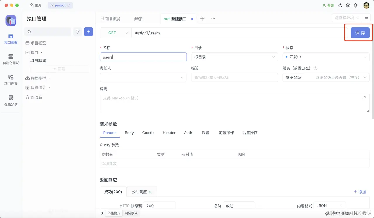 接下来就是 Apifox 的核心功能了,接口调试功能,我们需要创建一个个的接口,方便后面的调试