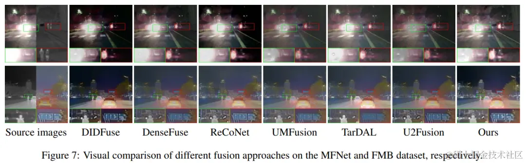 在视觉效果上,本文方法可以有效克服各类可见光降质因素的影响,例如强光干扰与极暗成像条件。一方面本文方法有效提取显著红外目标,例如第一行的行人。另一方面,本文方法可以有效保存纹理细节,更有利于后续语义分割任务。