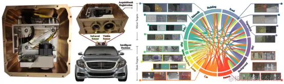 此外,我们构建了一个智能多波段双目成像系统,并收集了一个用于融合和分割且内有15个像素级类别注释的多模态场景解析数据集。该数据集标注率高达98.16%,包含在不同光照条件下的各种真实驾驶场景,还包括带有雨、雾、强光等特殊情况的挑战场景。所提出的数据集克服了领域现存数据类别较少、注释稀疏和场景单调的问题,旨在促进实际的自动驾驶和语义理解任务的发展。