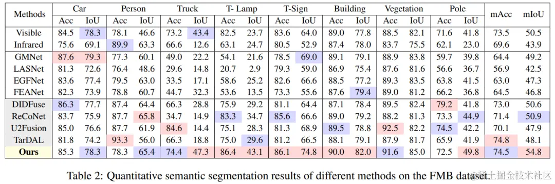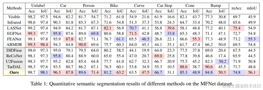 我们在 MFNet 和 MFB 数据集上都取得了最高的 mIoU,与第二名相比提高了 7.66%。同时注意到我们的方法对于人和车的优越结果意味着我们的方法在应用于现实世界感知时有更高的性能。
