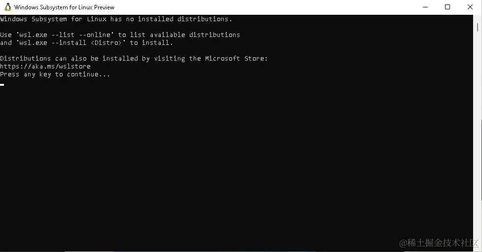 但是,如果你确实想在不安装发行版的情况下打开 WSL 应用程序,你将看到一条简短的帮助消息,你必须遵循该消息才能使用 WSL 进行一些有用的操作: