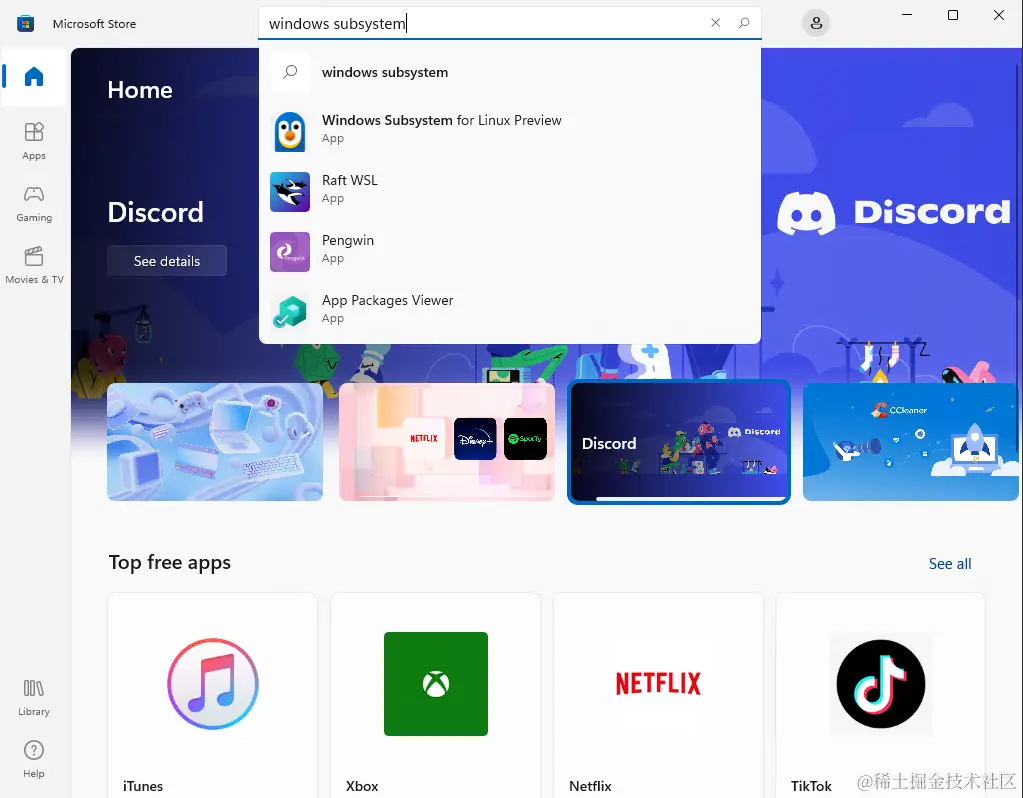 若要从Microsoft存储安装 WSL 应用程序,请打开它并搜索 Windows 子系统。