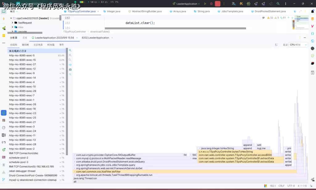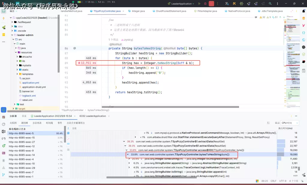 在调用树视图中,我们一直点下去,看到下面这个方法,占用了33.8%时间啊,这不得赶紧优化一下