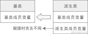 理由很简单,基类不包含派生类的成员变量,无法对派生类的成员变量赋值。同理,同一基类的不同派生类对象之间也不能赋值。要理解这个问题,还得从赋值的本质入手。赋值实际上是向内存填充数据,当数据较多时很好处理,舍弃即可;本例中将 b 赋值给 a 时(执行a=b;语句),成员 m_b 是多余的,会被直接丢掉,所以不会发生赋值错误。但当数据较少时,问题就很棘手,编译器不知道如何填充剩下的内存;如果本例中有b= a;这样的语句,编译器就不知道该如何给变量 m_b 赋值,所以会发生错误。