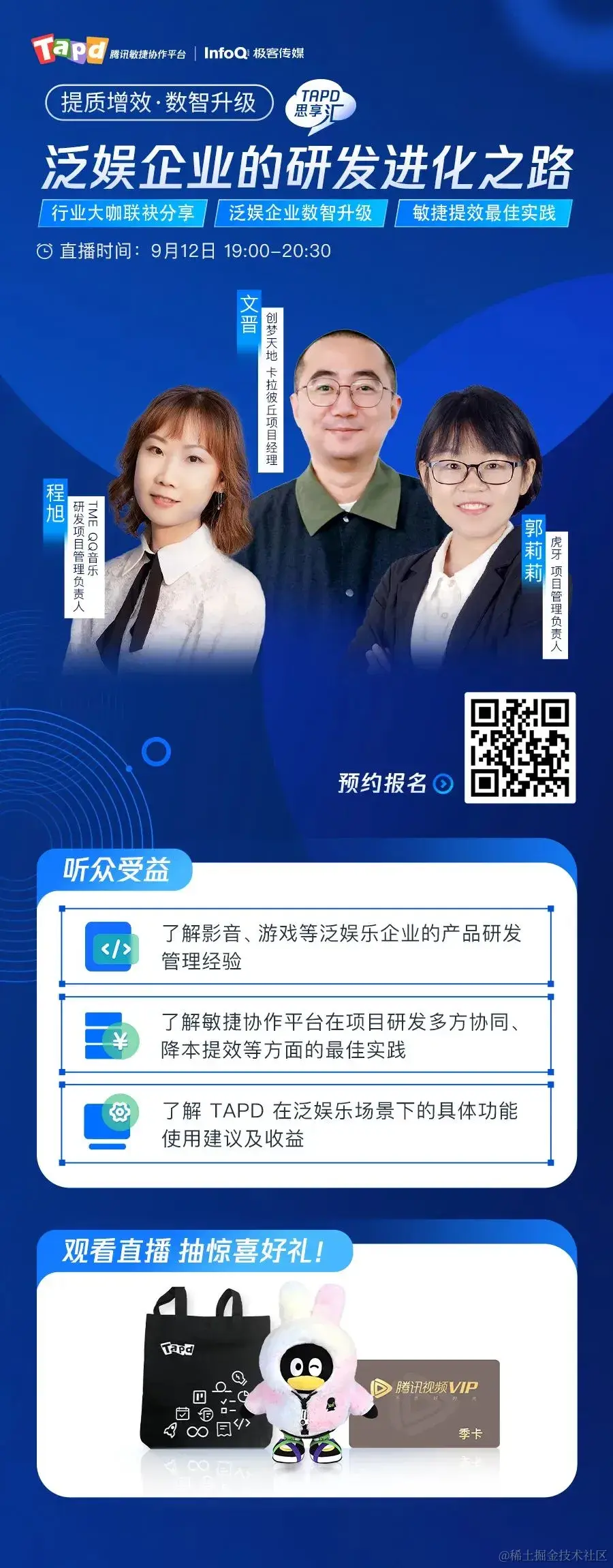 本期 「TAPD 思享汇」于2023年9月12日进行直播,将聚焦腾讯自研的敏捷协作平台 TAPD 在泛娱企业的最佳实践,邀请行业专家围绕泛娱企业敏捷提效、数智赋能的经验展开分享,为企业加速数字化转型提供可借鉴的探索模式,助力企业高质量、可持续发展。