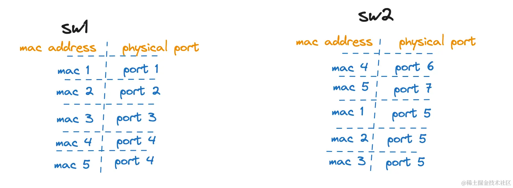 - 然后等到找到第二台交换机,到下一次6号设备1号设备的时候,在* sw2*中记录[1号设备mac地址,5号端口];
