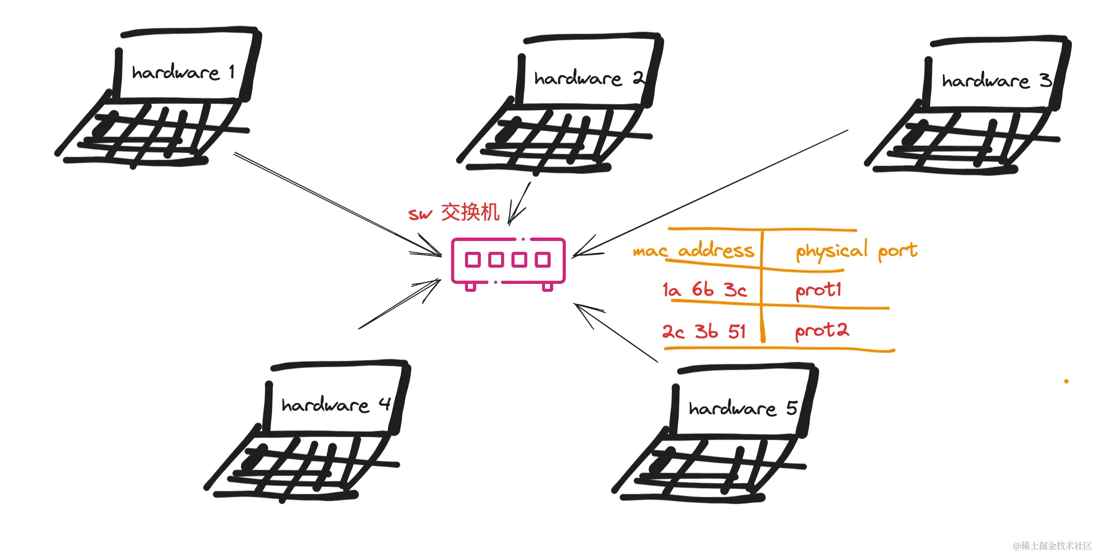 [mac地址,物理端口]; - 依次往复,所有的设备中的mac地址和物理端口被记录下之后成为一张表;