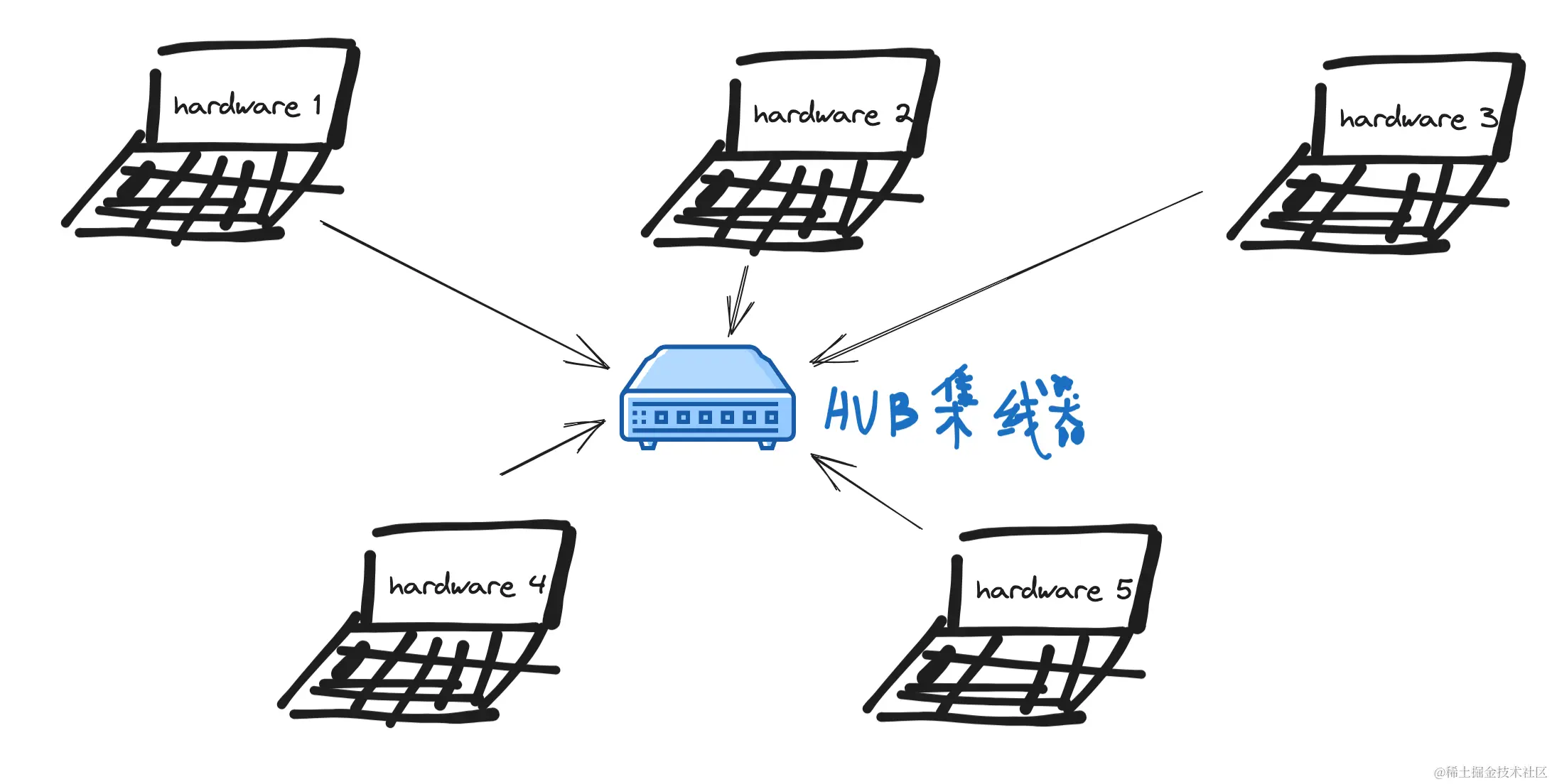 - 数据转发的时候,不是Hub集线器去判定数据从哪个源出来,到哪里去,而是把所有的信息都转发的所有设备上;导致数据传输速度差;网络链路的利用率差;