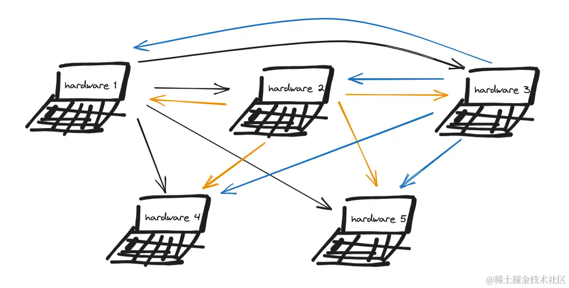 在这种情况下,就出现了一个问题,如果我有多个设备,那么为了保证多个设备上都能够传输数据,就导致我的连线特别复杂: