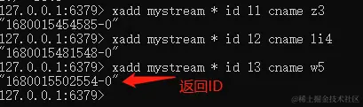 添加消息到队列末尾,消息ID必须要比上一个ID大,默认用星号表示自动生成ID;* 用于XADD命令中,让系统自动生成ID;
