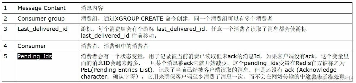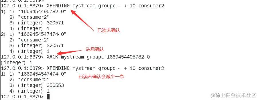 Streams 会自动使用内部队列(也称为 PENDING List)留存消费组里每个消费者读取的消息保底措施,直到消费者使用 XACK命令通知 Streams"消息已经处理完成”。 消费确认增加了消息的可靠性,一般在业务处理完成之后,需要执行 XACK 命令确认消息已经被消费完成