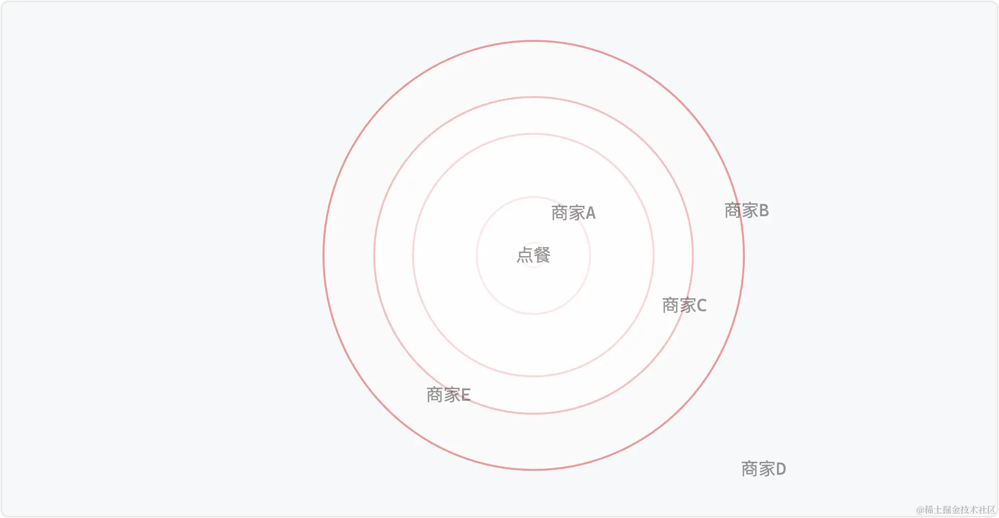 我们先明确一下需求,每个商家都有一个地址对吧,我们也有一个地址,我们点餐的时候,就是以我们自己所在的位置为圆心,向外辐射,这一圈上有一堆的商家。类似我下方的图展示: