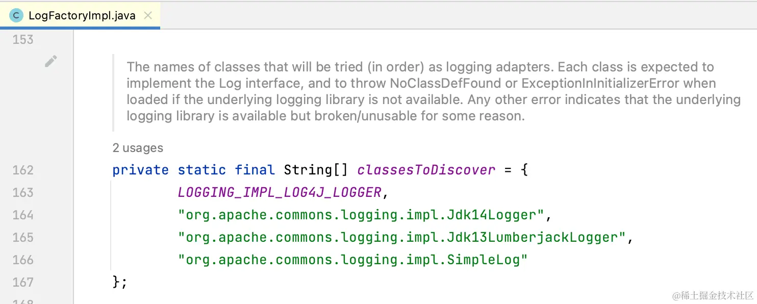 2002年8月Apache推出了日志接口JCL(Jakarta Commons Logging 或 Apache Commons Logging),因为前面出现了Log4j 和 JUL,apache 希望统一日志抽象,通过动态查找的机制,在程序运行时自动找出真正使用的日志库。Commons Logging 定义了一套日志接口,具体实现则由 Log4j 或 JUL 来完成。开发依赖JCL接口,日志实现可以在 log4j和JUL之间切换,在 classpath 中如果找到 log4j 则使用 log4j,如果没有找到 log4j 则使用 jdk自带的JUL。