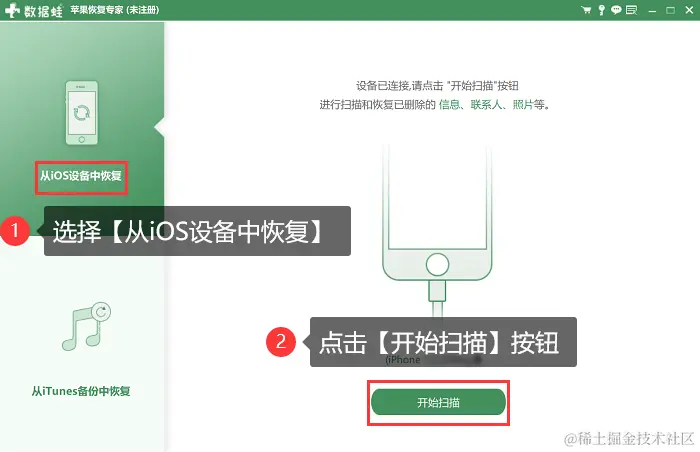步骤2:打开软件后用数据线连接您的iPhone到电脑,然后点击【开始扫描】按钮。
