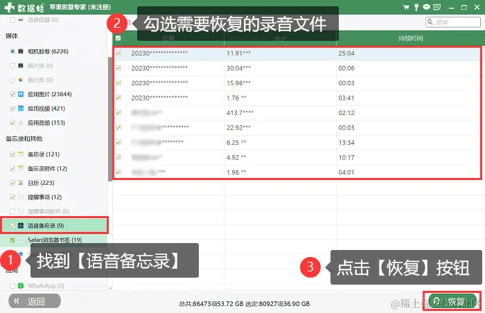 步骤3:待数据全部被扫描出来后,点击左侧目录中的【语音备忘录】选项,可以看到列表中解析出来的录音文件。紧接着勾选好想要恢复的录音,最后点击【恢复】选项将所勾选的录音恢复到电脑当中。
