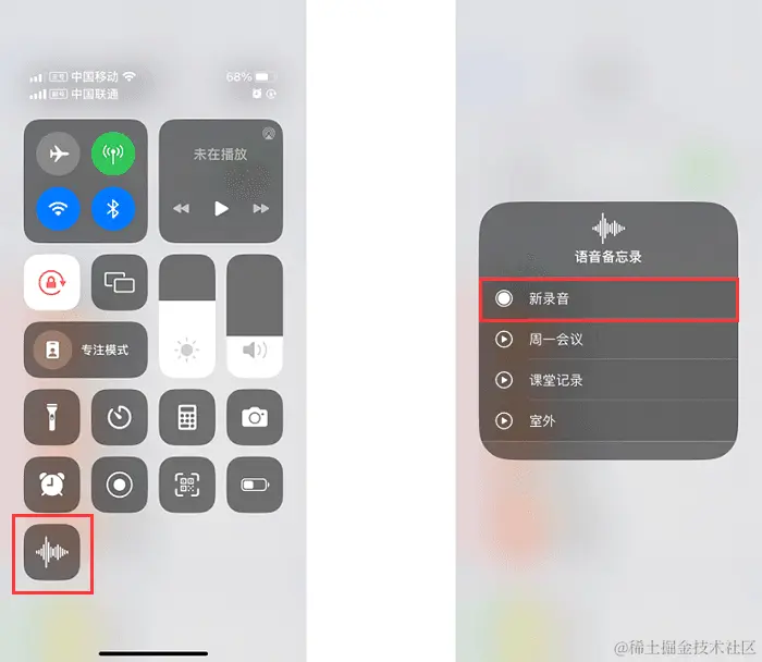 步骤3:设置完成后下拉控制面板长按【语音备忘录】图标,在弹出的窗口中点击【新录音】,手机便会自动开始录制。