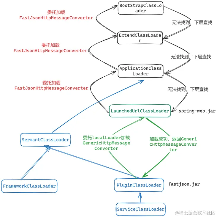 - 当运行时若Agent需要使用spring-web的类GenericHttpMessageConverter时,则可通过Sermant提供的局部类加载环境成功通过LaunchedUrlClassloader成功从Spring应用中获取。