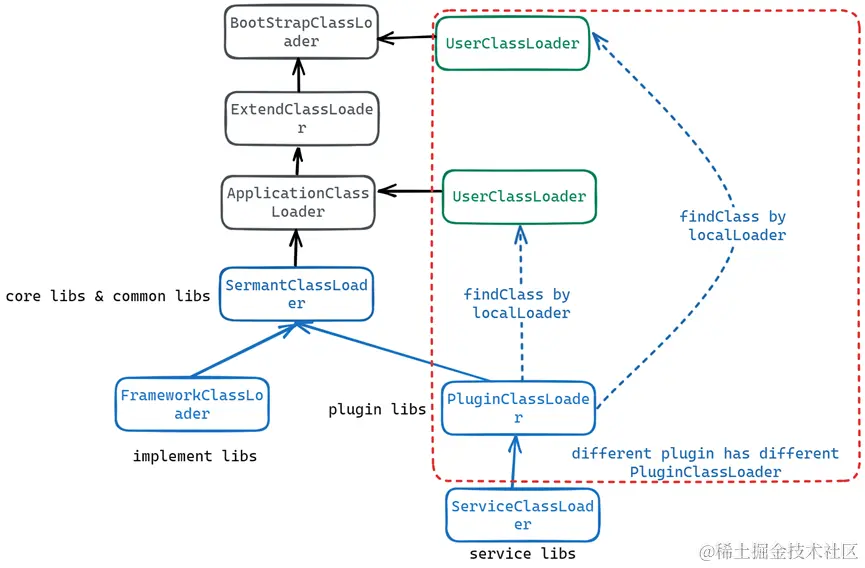 - PluginClassLoader,遵循双亲委派,主要用于隔离Sermant各服务治理插件,避免不同服务治理插件之间产生类冲突问题。