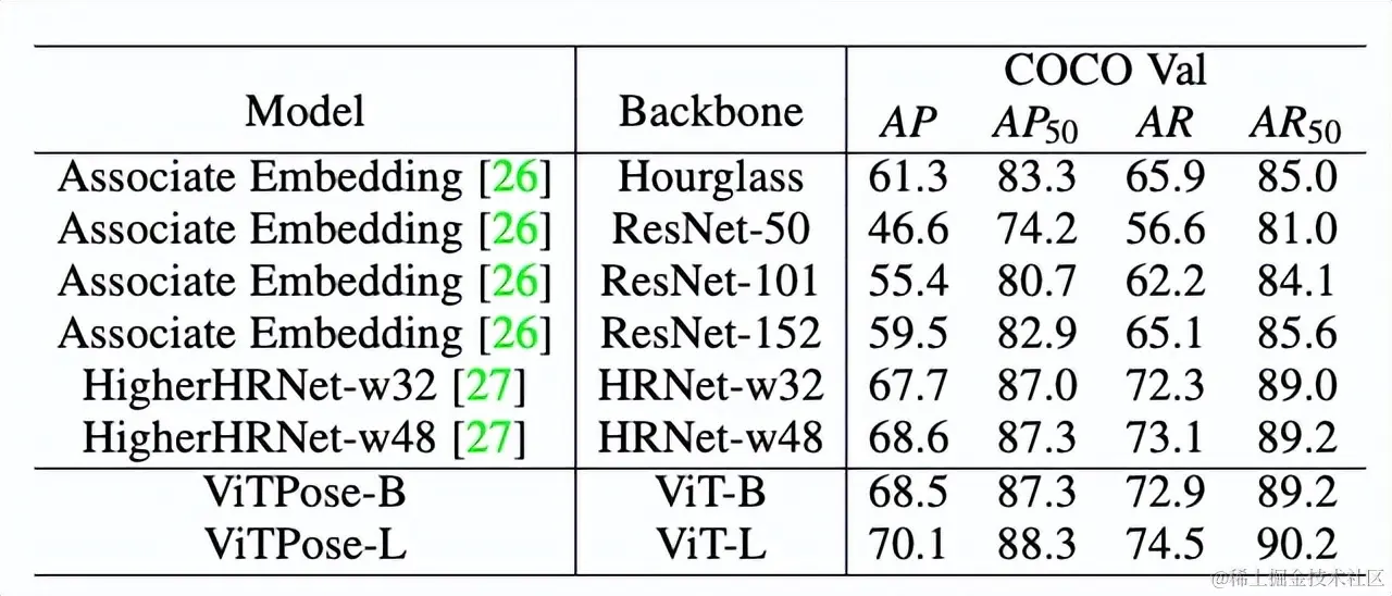 为了验证ViTPose的简单性和可扩展性,研究者使用了不同的解码器和不同尺寸的编码器,结果如表1所示。相比于使用经典的反卷积解码器,使用简单双线性解码器的CNN模型出现了极大的性能下降,如ResNet-50和ResNet-152有接近20平均准确度的下降。然而,视觉transformer模型则表现出了很强的竞争力:使用简单的解码器和经典解码器的性能差距不到0.3平均准确度,充分说明由于视觉transformer的强表征能力,它可以学习到线性可分性极强的特征表示,从而仅需要简单的线性解码器即可以达到很好的效果。此外,使用更大规模的编码器,ViTPose的性能持续上升,展示了ViTPose良好的扩展性。