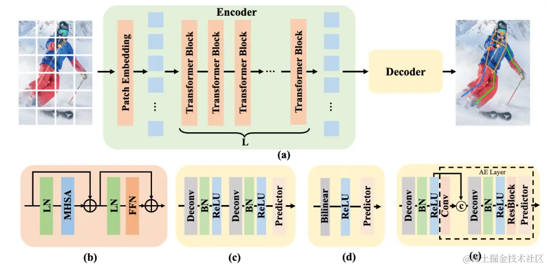 为了尽可能避免复杂的设计,ViTPose采用了最简单的方式来应用简单的视觉transformer。具体来说,ViTPose使用了简单的视觉transformer作为编码器对输入图像进行特征提取。提取得到的特征会作为解码器的输入来得到最终的关键点预测。带有transposed卷积上采样和预测层的标准解码器(c)和直接使用双线性插值的简单解码器(d)被用于评估简单视觉transformer的简单性;用于Bottom-up预测的解码器(e)也被采用来衡量ViTPose对于不同关键点检测范式的灵活性。