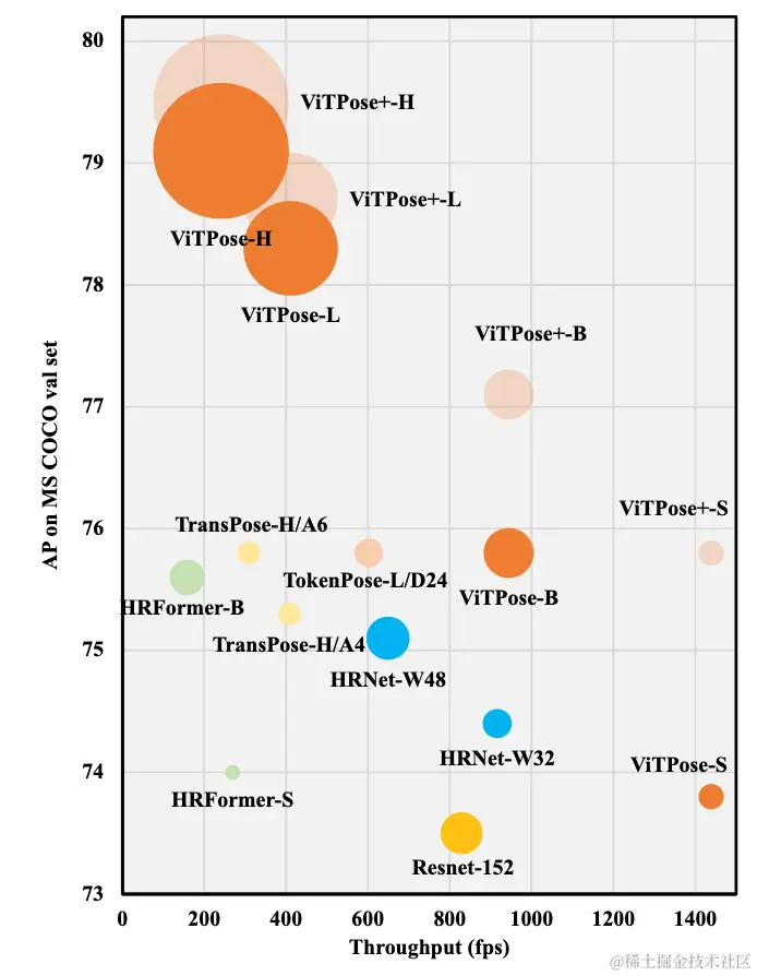 ViTPose和ViTPose+的性能和速度对比图,圆圈大小代表了模型大小