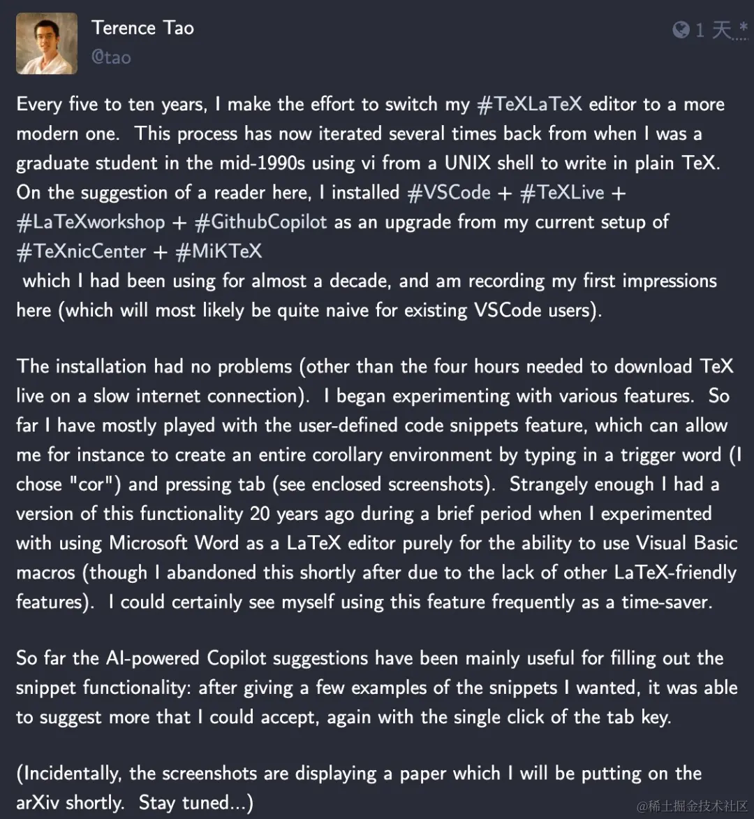 除了日常使用 AI 工具辅助解决数学问题,陶哲轩最近还表示自己在一篇即将发表的论文中,使用了 AI 工具来编辑排版数学公式,具体来说是使用了 VSCode + TeXLive + LaTeXworkshop + Github Copilot。
