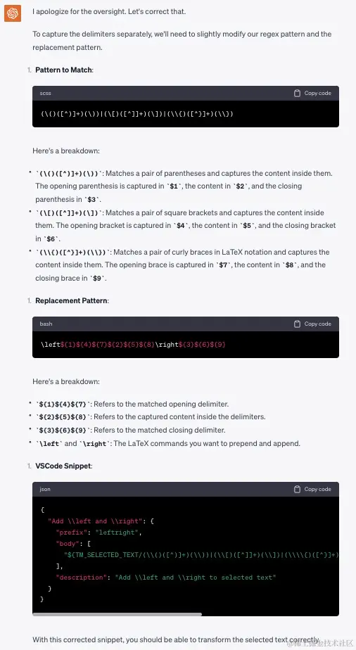 ChatGPT 首先根据要匹配的文本格式给出了正则表达式,并且对正则表达式的每一部分给出了详细的解释,最后给出了一段 VSCode 代码: