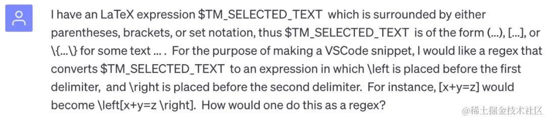 具体来说,他想要一个可以采用 LaTeX 表达式(例如 (x+y=z))的代码片段,并将 \left 和 \right 作为分隔符(例如 \left (x+y=z \right)。