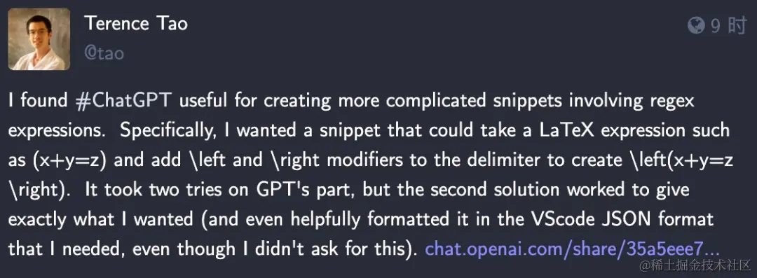 陶哲轩表示 ChatGPT 能够生成涉及正则表达式的复杂代码片段,并且很有效。