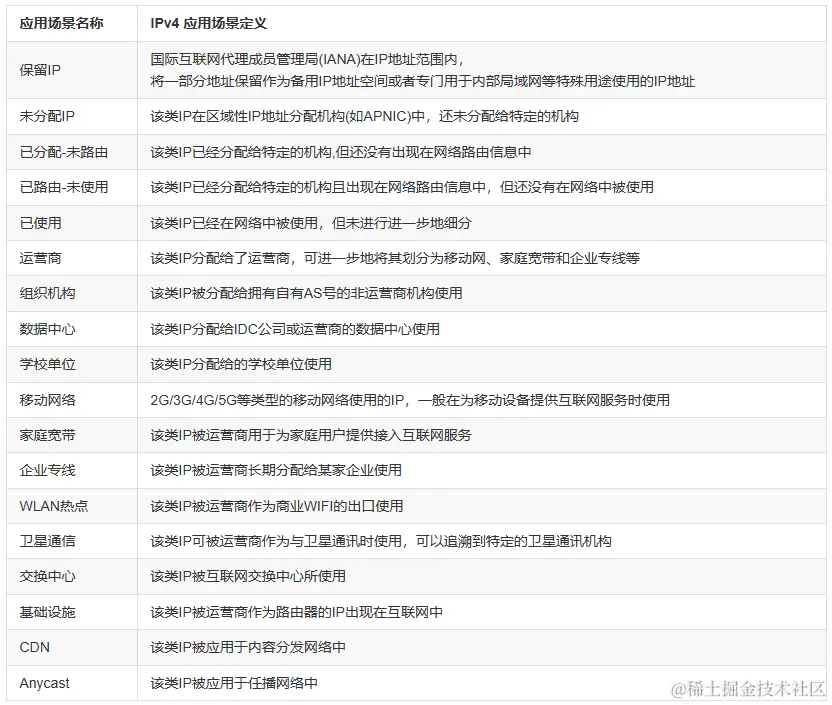 让我们先了解一下IP应用场景查询API是什么。简而言之,它是一种获取IP场景属性的在线调用接口,允许开发人员通过编程方式查询指定IP地址的应用场景信息。APISpace 的 IP应用场景接口,不仅可以查询 IPv4 的应用场景,还可以查询 IPv6 的应用场景;查询指定IP地址的应用场景属性,具备识别IP真人度,提升风控和反欺诈等业务能力。IP应用场景基于地理和网络特征的IP场景划分技术,将IP划分为含数据中心、交换中心、家庭宽带、CDN、云网络等共计18类应用场景。大家可以使用测试一下~