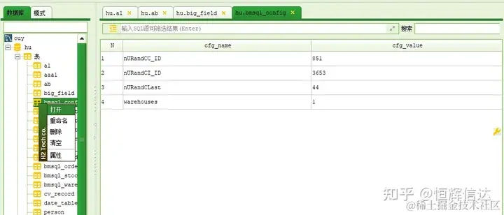 选择表,右键,点击“打开”,主面板将打开一个tab页显示表数据.