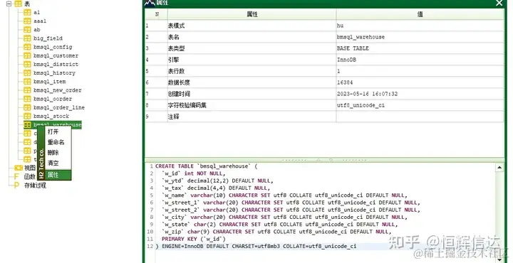 选中表节点下的具体表,右键弹出菜单中选择“属性”。
