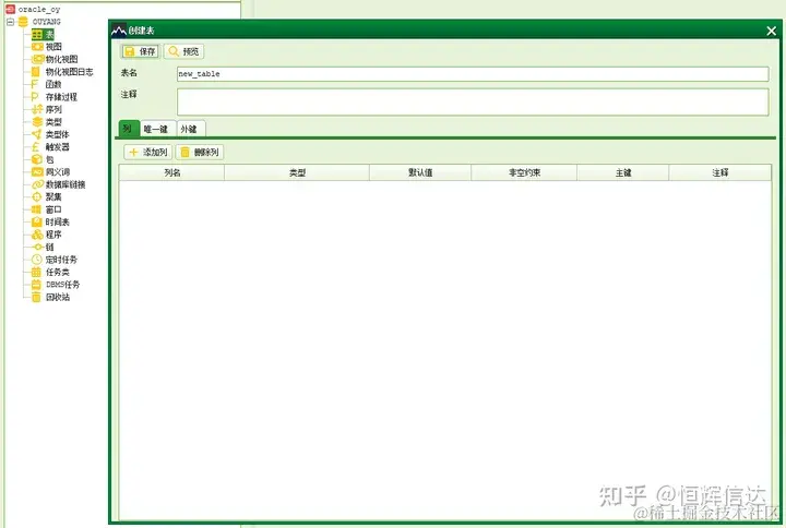 右键树形结构的表节点,在弹出菜单中选择“新增”,会弹出创建表的表单,可以输入表名称,注释,点击添加列,输入列名,选择类型,默认值等。