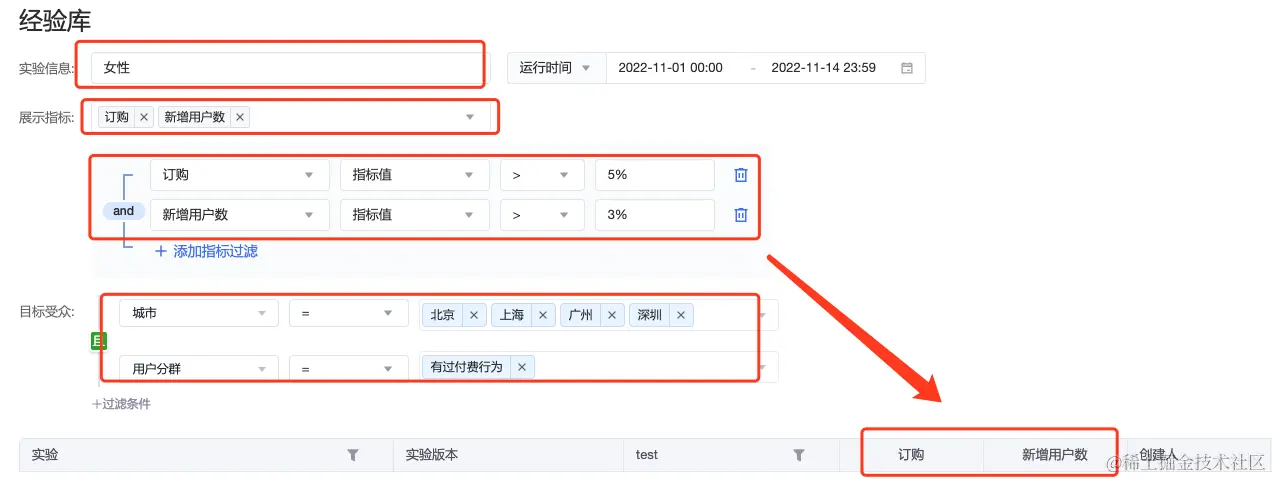 如果想进一步拆分针对上述人群中与“使用活跃度”有关的实验,那么可以在指标选取上更加细分和灵活。例如可选取“新增用户数”指标,来查看往期试验中,提升了目标群体日活的实验;与此同时还可选取“订购”指标,查看往期试验中提升了目标群体消费情况的实验。