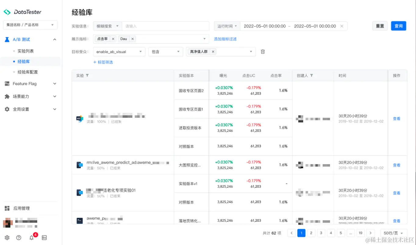基于在字节跳动已完成150万余次A/B实验的经验,DataTester 首创了A/B实验经验库功能。该功能可帮助业务人员将历史的A/B实验经验沉淀,并通过条件筛选,快速找到所需实验信息并进行数据分析。汲取过往在A/B实验设计和结果方面的经验,并了解优化方向,更好为后续的业务赋能。