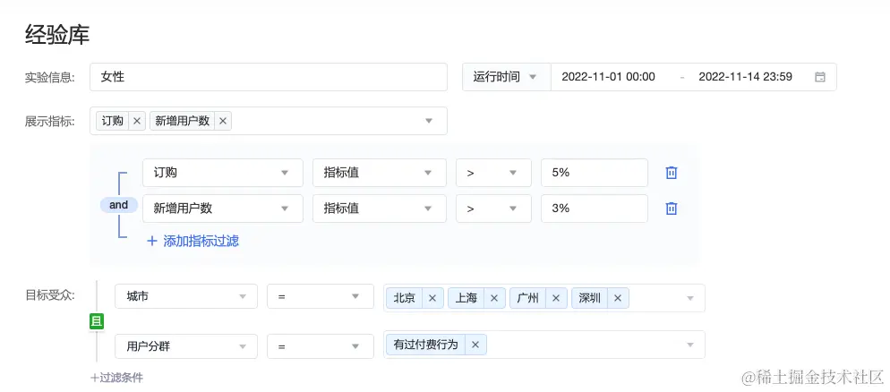 - 目标受众:支持筛选实验目标人群包,可按公共属性和用户分群等维度进行筛选。