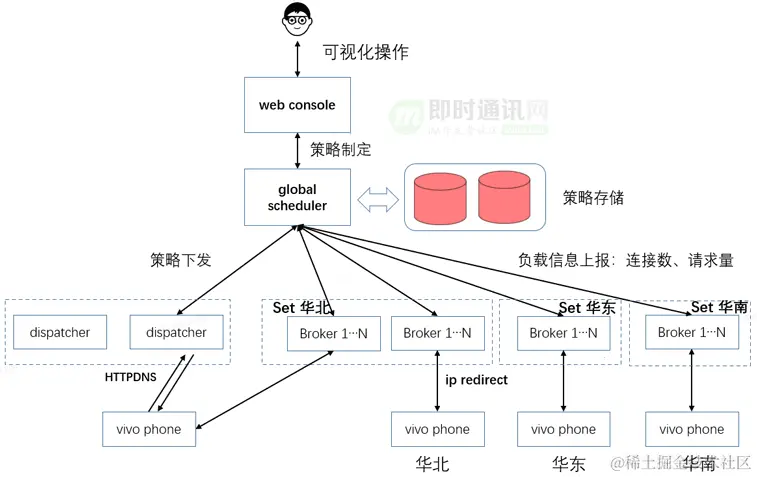 针对上述单个地区异常导致该区域部分设备无法收到推送消息的问题,我们设计了一套流量调度系统,可以做到实时流量调度和切换。global scheduler节点负责策略调度和管理。