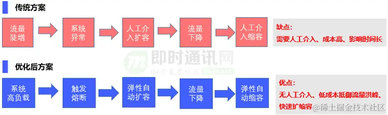 一旦流量超过了部署机器可承担的上限,无法及时扩容,可能导致可用性下降,甚至出现雪崩效应。