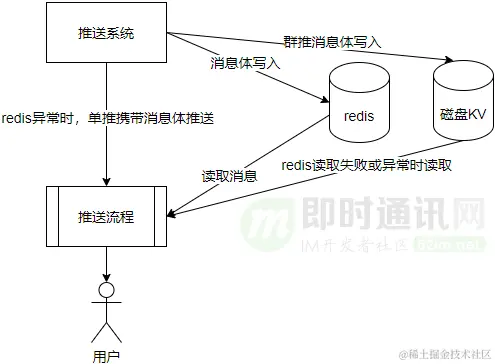 如果Redis集群故障,对于单推消息,推送系统可以携带消息体往下游推送,确保消息可以继续下发。对于群推消息,因为消息体冗余存储在磁盘KV中,当Redis集群故障后,可以降级到读取磁盘KV。