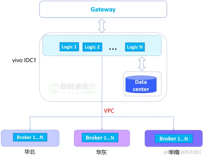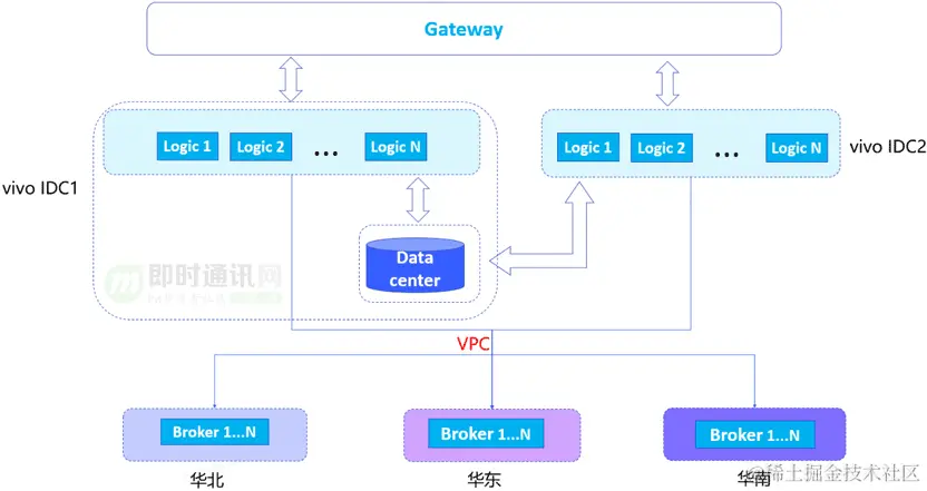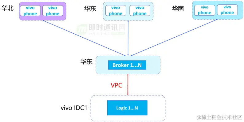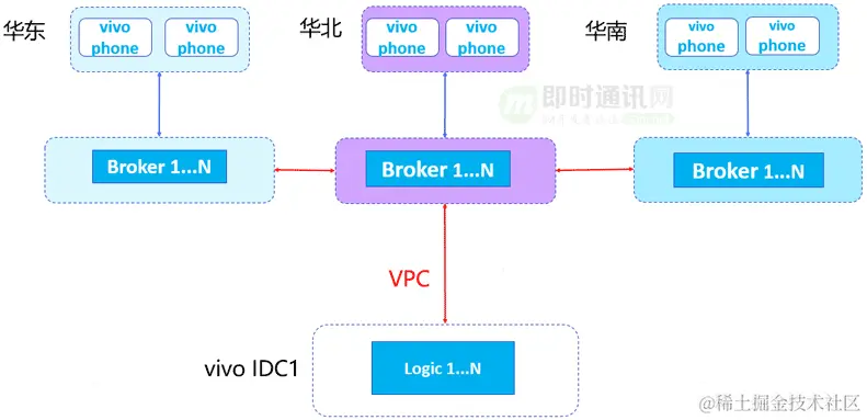 原有推送系统架构是长连接层都部署在华东,所有vivo IDC逻辑节点通过VPC与华东的Broker建立连接,手机端跟华东的broker进行长连接通信。