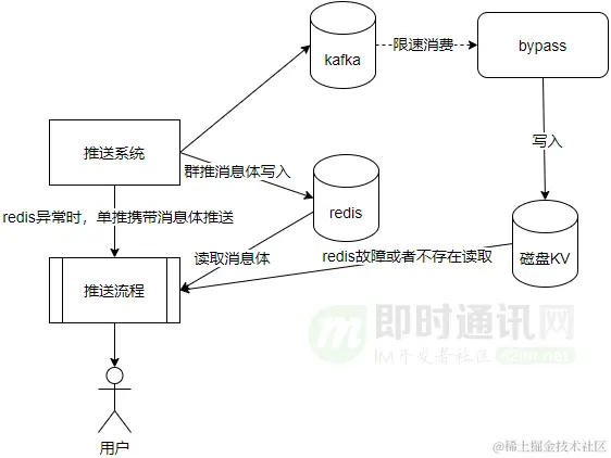 这里将备份群推消息体,先写入消息中间件KAFKA,由bypass节点消费KAKFA进行异步写入磁盘KV。这样在使用的灾备磁盘KV资源较少的前提下,保证推送系统的高并发能力,同时可以保证群推消息体不丢失,Redis异常时,单推消息携带消息体推送,群推消息体读取磁盘KV。