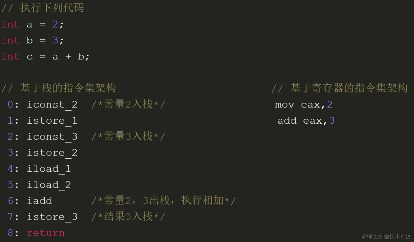 - JVM指令流中的指令大部分是零地址指令,其执行过程依赖于操作栈。指令集更小,编译器容易实现;