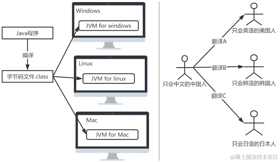 对于不同的操作系统,Oracle提供了不同版本的JVM,所以只需要将程序编译成一个.class文件,就可以运行在不同操作系统的JVM上