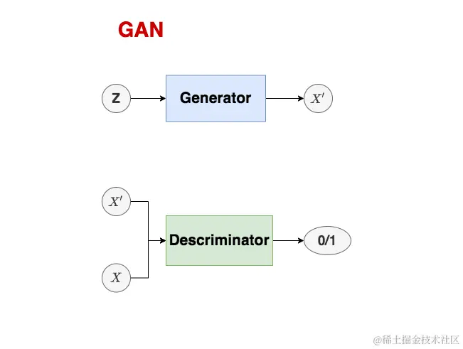 如图,GAN由一个生成器(Generator)和一个判别器(Descriminator)组成。