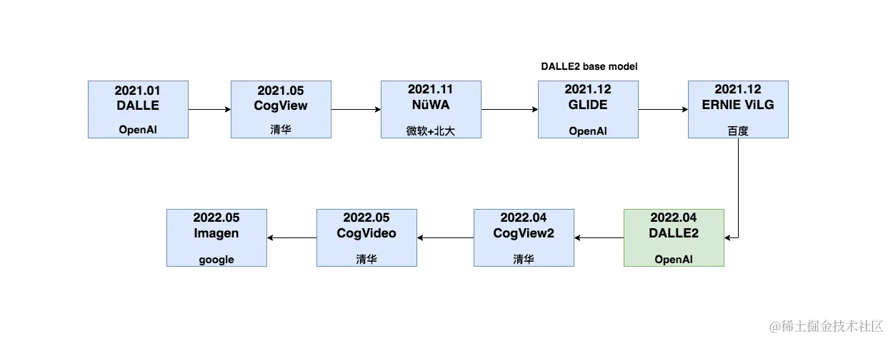 上图回顾了2021-2022间文生图模型的密集发展历史,看看不同模型的诞生时间差,就可以大体感知到各家当时都卷成什么样了。我们今天要讨论的DALLE2,是DALLE的第二代,诞生于2022年4月,原名叫unCLIP。