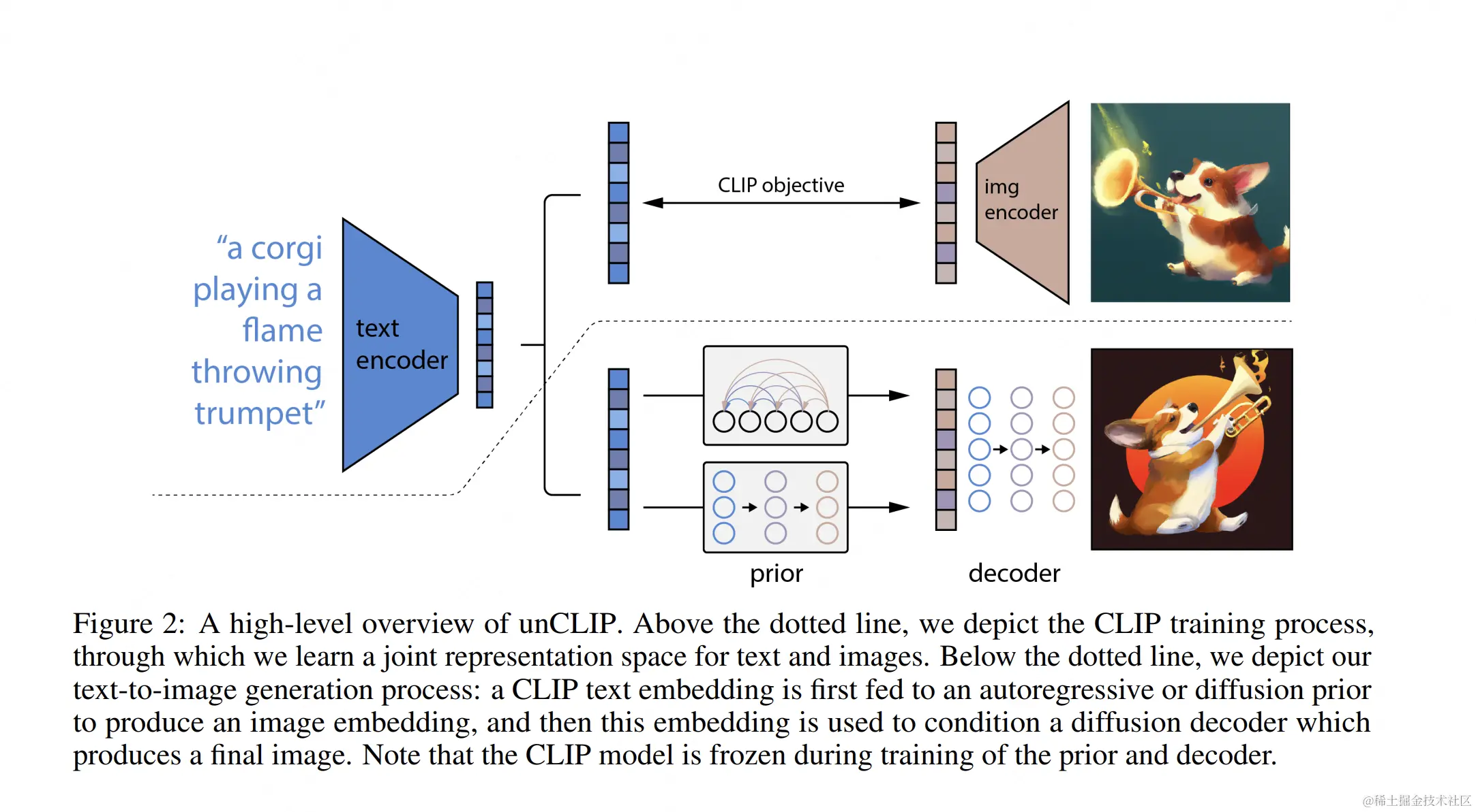 细心的你可能发现了,在模型架构中,最开始作为标签的柯基图和最终生成的柯基图好像不太一样,但都贴合文字的描绘。这其实也是DALLE2的目的之一:使得生成的图片具有多样性。而达成这一目的手段是因为加入了decoder架构。接下来,我们就来详细分析一下DALLE2中的CLIP,prior和decoder。