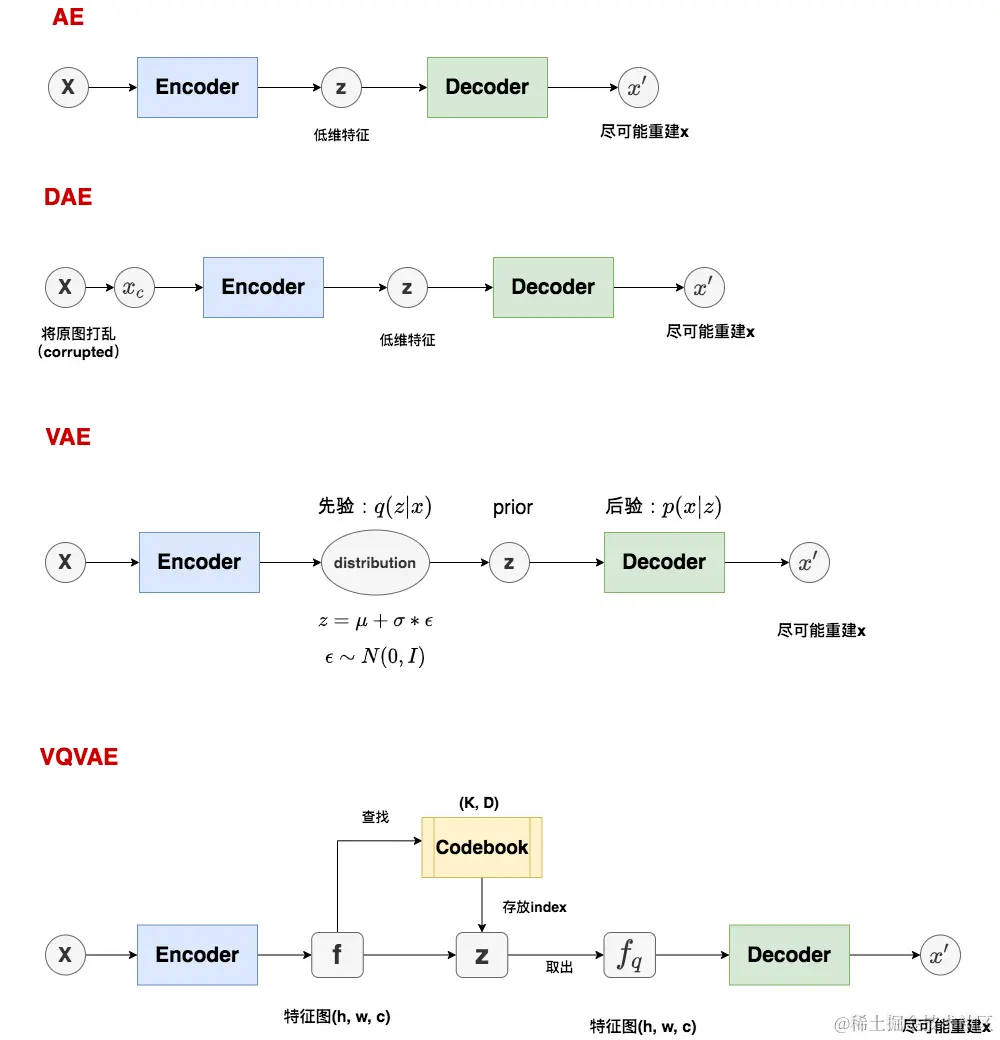 如果说GAN的训练是想从随机噪声入手,去生成符合真实世界分布的图片。那么AE(AutoEncoder)系列在训练时,则是希望通过encoder-decoder架构,在一定程度上“打乱”原始图片,然后再去重建它,通过重建的过程,让模型学到图片的真实分布。