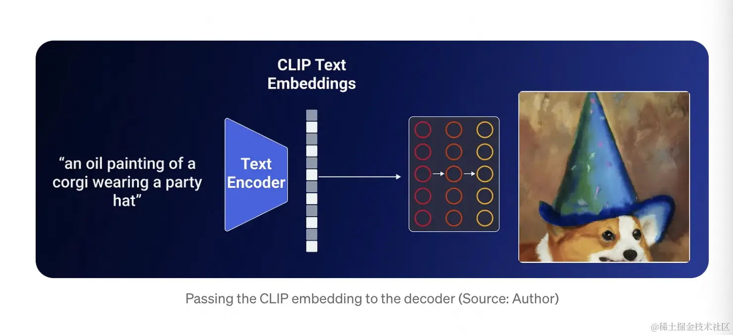 (4)最后,是decoder模型。我们用prior产出的image embedding作为输入,送进decoder模型,产出最终的图片。在这里,decoder模型也是一个扩散模型。